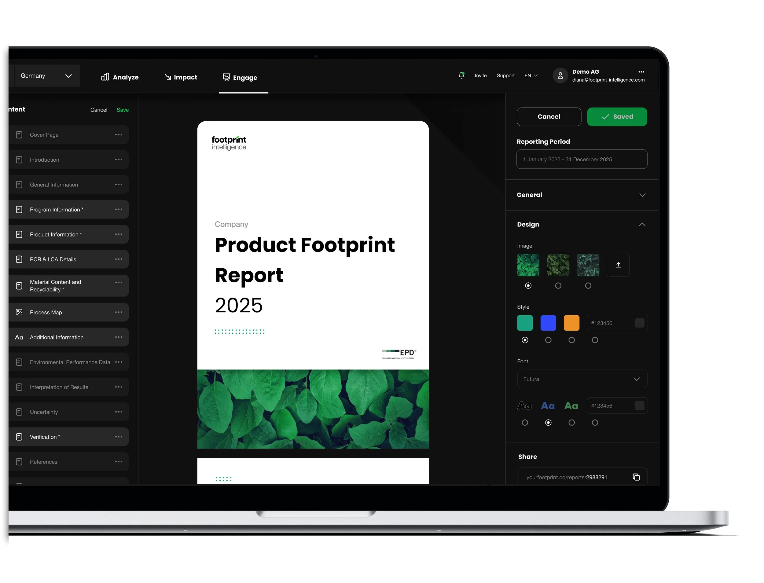 Your data, transformed into beautiful, compliant reports in seconds. No matter whch format - from CSRD, GRI to GHG. Impress your customers and management.